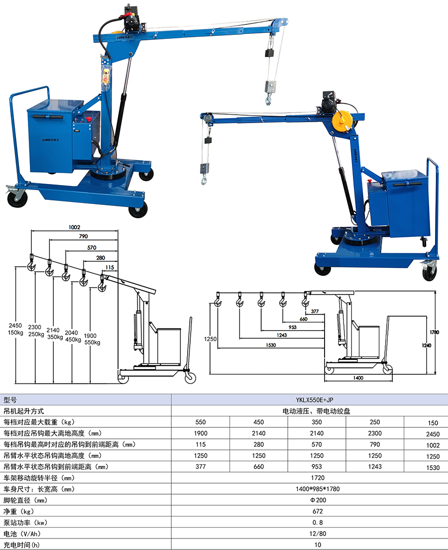 ● 吊臂長度可五工位手動調節,配有鍛造重載可旋轉吊鉤