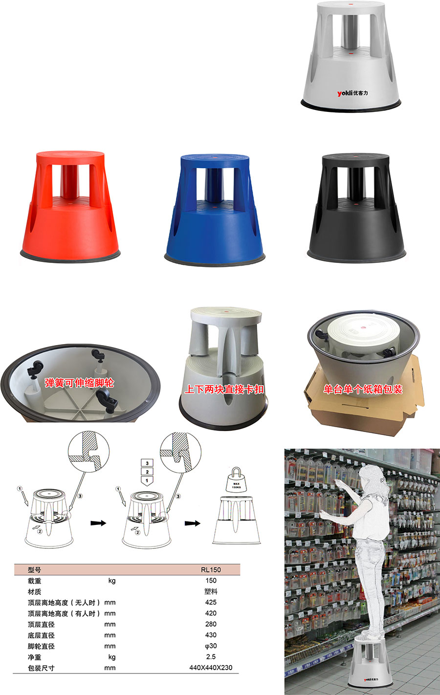 ● 鋼質腳凳標準顏色為灰色、藍色,有紅色、黑色可選。